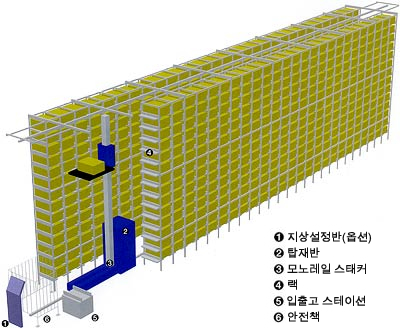 버킷・컨테이너 보관용 랙, 모노레일 스태커, 컨트롤러, 입출고 스테이션을 표준화한 가격경쟁면에서 우수한 입체자동창고시스템입니다.