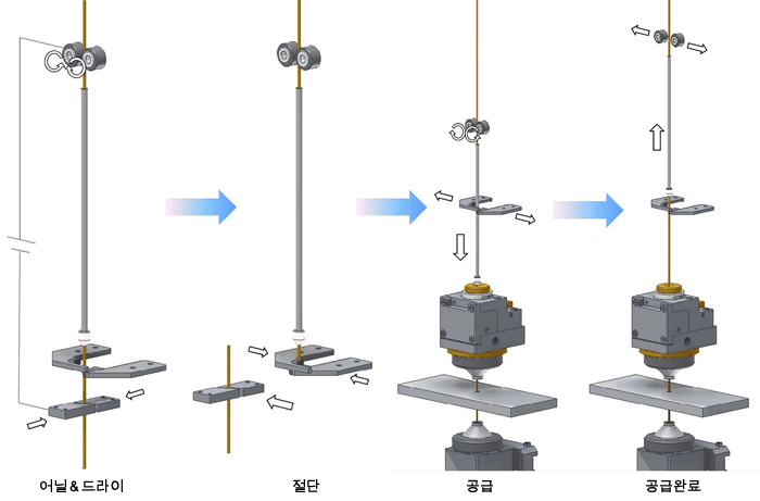 어닐(anneal) 전류를 흘려 열을 가한 후 당기는 동작(어닐&드라이)를 반복함으로써 확실하게 선을 자동으로 연결시킬 수 있게 되었습니다.(유럽・미국・일본 특허취득)