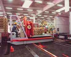 トラックへ自動積込みをおこなうトラック移載装置。リフタ―装置とコンベヤの組み合わせで、自動積み込みを行います。